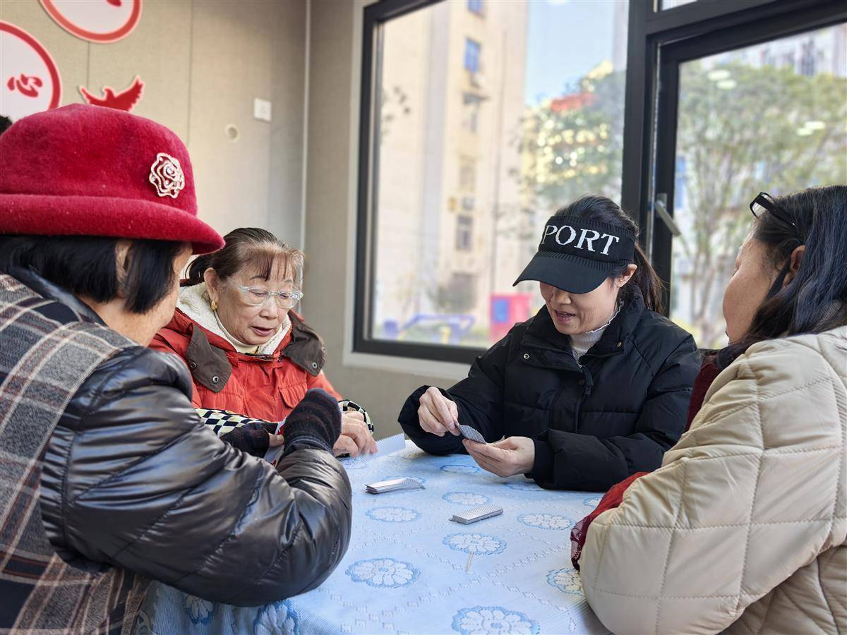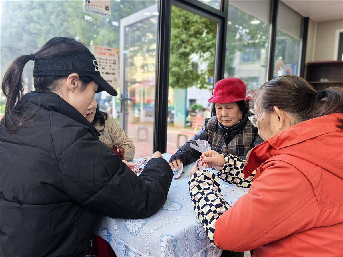老东谈主们在月圆一村城市驿站里打纸牌,分享共管好意思好环境。(湖北日报全媒记者方桐 摄)