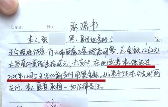 餐馆雇主报了警,民警跟所谓组局者打了电话,对方暗示他也没钱,要筹钱。在民警合营下,张某写了承诺书,押下身份证,认知次日18点前结账。
